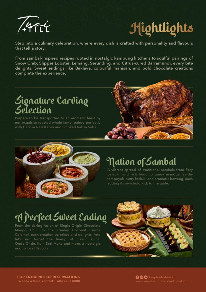Step into a culinary celebration, where every dish is crafted with personality and flavours that tell a story. The expansive seasonal dining buffet unfolds across two distinctive phases, each crafted to showcase how sambal connects memory with modernity.