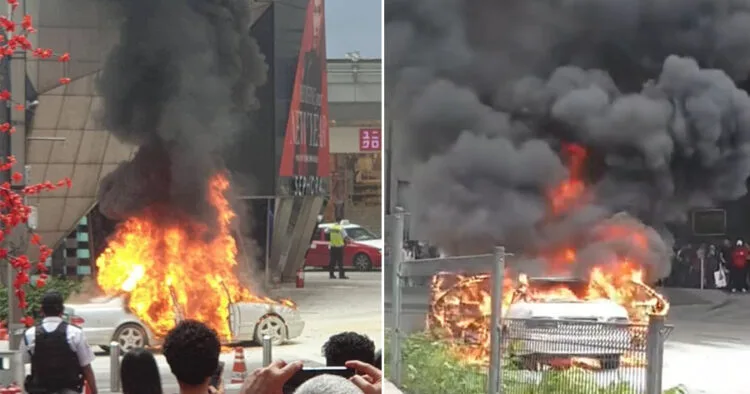 A Mercedes-Benz mobile burst into flames right outside Pavilion shopping mall in Bukit Bintang, Kuala Lumpur. The incident happened earlier today (Tuesday, 14th January) at 12.40pm.