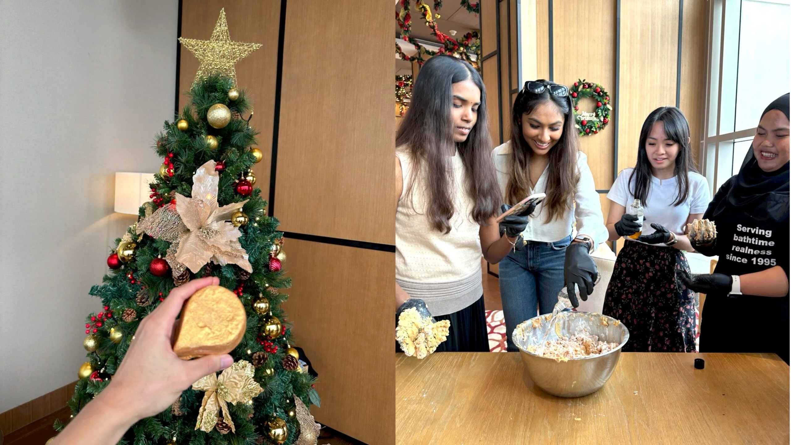 During the media launch at Altitude, we had the chance to participate in a Bubble Bar workshop, where we got to make a golden bath bomb from scratch. It was a fun process of mixing the various ingredients together and shaping it into a glittering bath bomb. After that, we were treated to Altitude’s festive Afternoon Tea. From Chawanmushi and Scottish Smoked Salmon in a bagel to Dark Chocolate Mousse and Passion Fruit Cheesecake, the set ticked off every box in our list of dessert heaven.