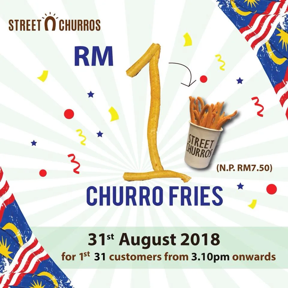 #JomChurros this Merdeka Day. Street Churros Malaysia is offering RM1 Churro Fries (normal price RM7.50) for Churro Fries which you can choose between 2 exciting savoury flavours – cheese or tomato flavour. This is only applicable to the first 31 customers from 3.10pm onwards at all outlets except SkyAvenue, Genting. Good luck and remember to flash this visual at the counter 🙂