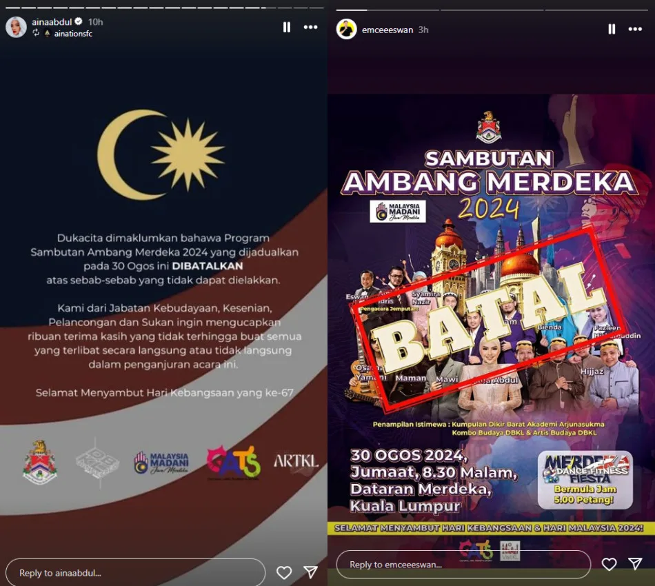 Professional emcee Eswan and singer Aina Abdul reposted the event’s cancellation on their Instagram Stories. Other celebs and performers who were supposed to join the festivity include Mawi, Hijjaz, Bienda, Maman, Osama Yamani, Syamira Nazir, and Fazleen Hishammudin. They have yet to speak out about the cancellation.