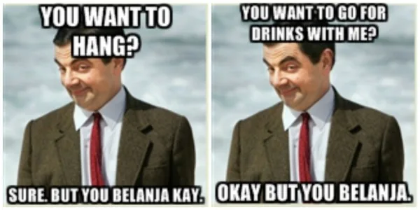 Derived from the Malay language, “belanja” means treat. As in to treat someone, be it drinks, food or a movie. We usually use the word “belanja” when people ask us out. Ie: “Hey, lets go drinks” is responded with “You belanja ah? Can”.