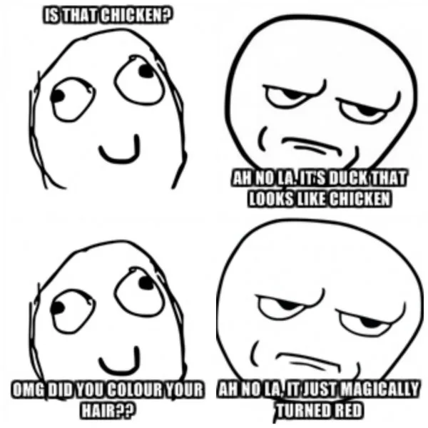 Usually used in a more sarcastic manner, “Ah, no la” is Malaysians way of saying DUHHH! For example, in response to obvious questions like “Did you colour your hair?”, one would reply with “Ah, no la. The colour magically changed by itself”.