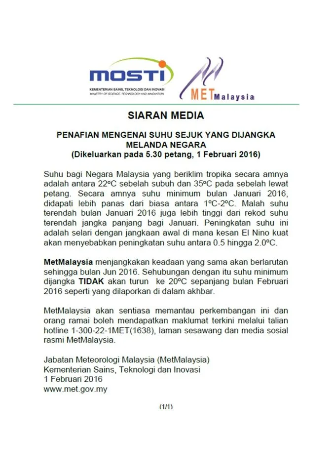 The Star Online quoted METMalaysia director-general Datuk Che Gayah Ismail as saying that the claim was not true and the temperature would remain within the normal range throughout February. “In fact, the statement was not from me. The lowest temperature of 16°C was actually referring to last year’s minimum temperature,” she said when contacted by The Star.