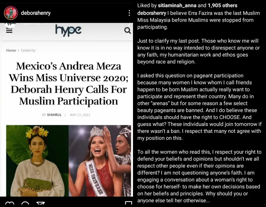 Speaking of Miss Universe, Miss Universe Malaysia 2011 Deborah Henry took to her Instagram to call for Muslim women to be allowed to participate in beauty pageants. According to the TV personality, the responsible parties need to “reevaluate the rulings” in order to enable equal rights for all women to participate in such competitions.