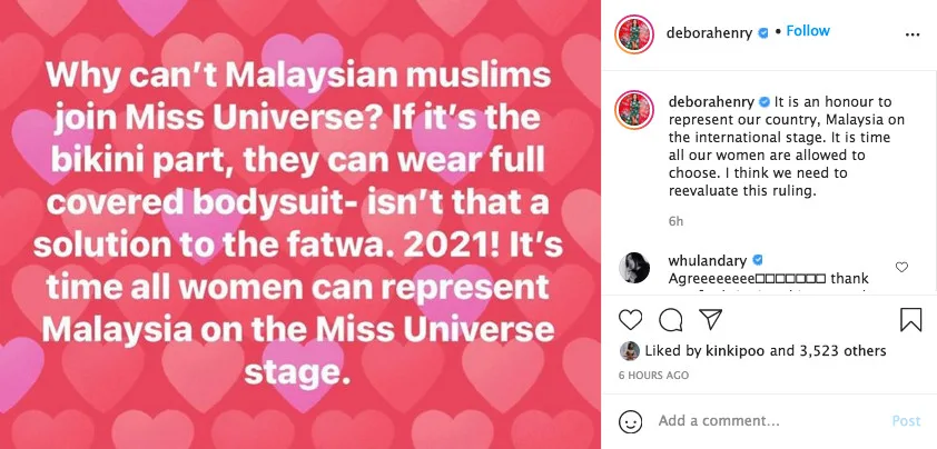 “Why can’t Malaysian Muslims join Miss Universe? If it’s the bikini part, they can wear full covered bodysuits. Isn’t that a solution to the fatwa? 2021! It’s time for all women to be able to represent Malaysia on the Miss Universe stage,” Deborah wrote.