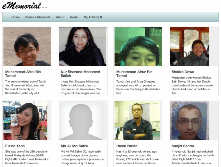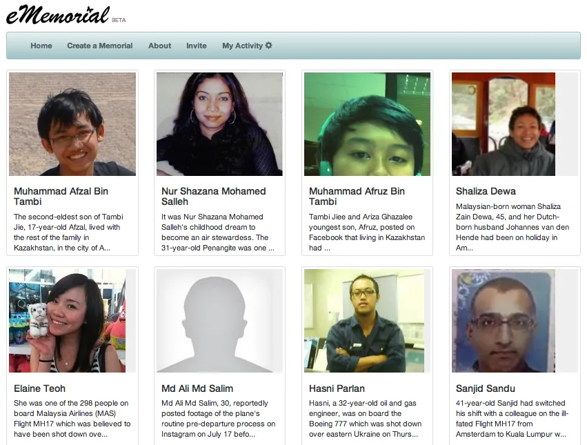 Netizens have set up a virtual memorial, accessible via Facebook, in honour of the 298 people who perished on board Malaysia Airlines (MAS) Flight #MH17. The e-memorial page contains the details of all the passengers and cabin crew, with pictures included for some of them.