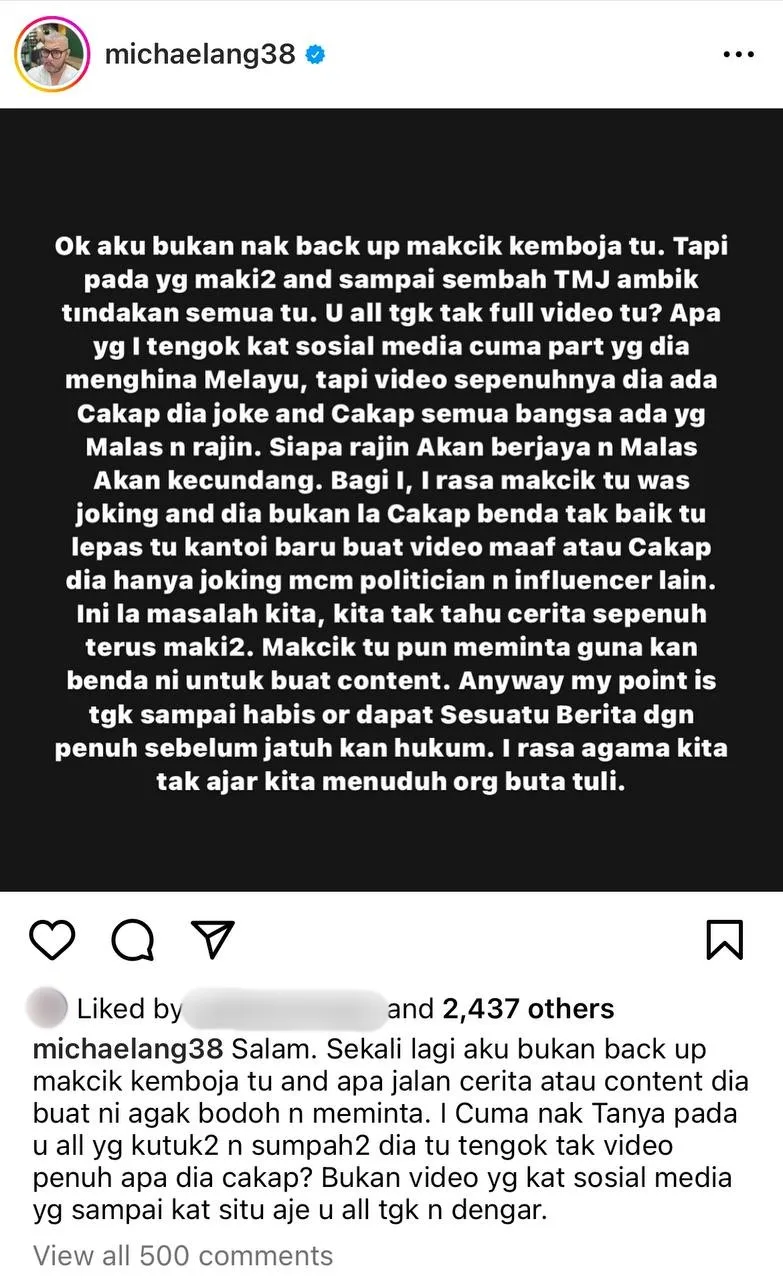 Yesterday (Monday, 20th November), producer-director Michael Ang posted on his Instagram to share his thoughts on the whole “Lazy Malays” or “Melayu Malas” issue that’s been going viral recently. In the post, the 47-year-old first made it clear that he was not defending MakCik Kemboja for her offensive joke before he proceeded to question netizens’ reactions towards the controversial video.