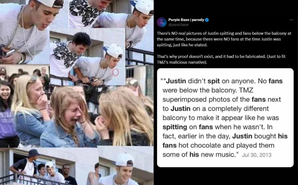 In 2013, rumours surfaced alleging that Justin Bieber spat on his fans. The claim was largely fueled by manipulated images showing the pop star allegedly spitting and fans crying. However, the images used were from different times and places, with no evidence of him spitting on fans. The singer himself clarified that he was not spitting but filming a video, and he later thanked fans with a heartfelt message. Fans who were present that day confirmed that the pop star was kind and even bought them hot chocolate.