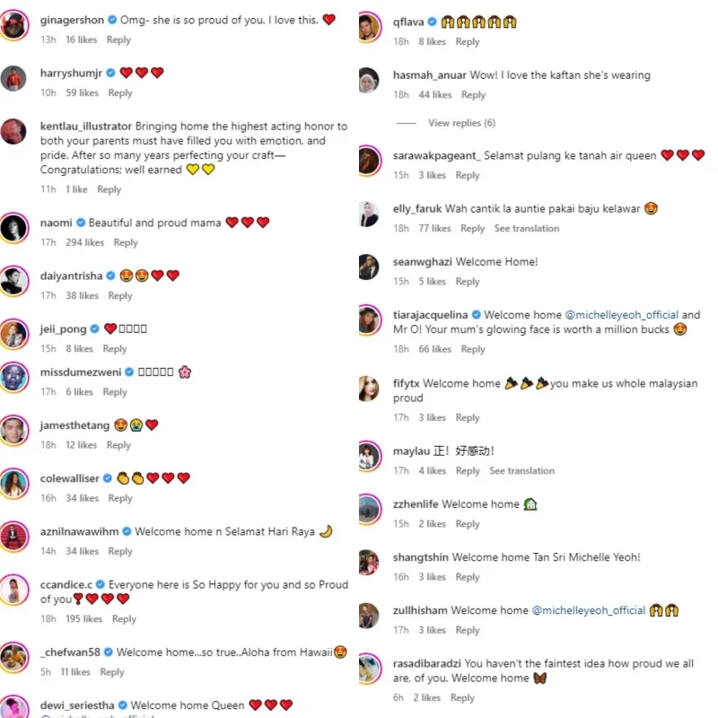 “Brought Mr. O home. Without my parents’ love and trust and support, I wouldn’t be here today. Love so much ❤️💖✨❤️✨,” she captioned the post, paying tribute to both her parents. Many Malaysian fans and fellow celebs welcomed the “Everything Everywhere All At Once” star home while showing their love and support for the Yeoh family by commenting on the heartwarming post.