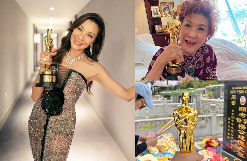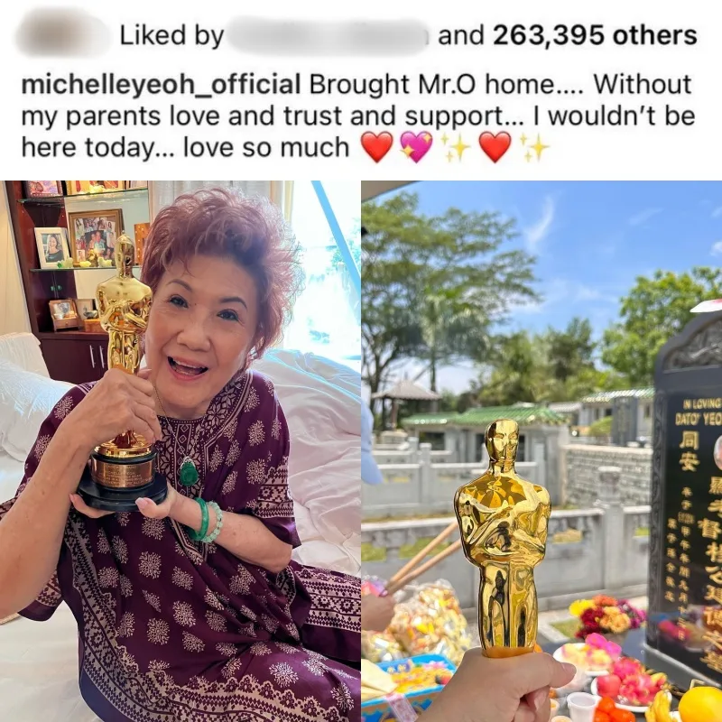 Yesterday (Wednesday, 12th April), Michelle Yeoh posted 2 photos on her official Instagram. The first photo showed her mother Datin Janet Yeoh happily posing with the Oscar trophy in her hands. The second photo was of the trophy in front of the actress’s late father, Datuk Yeoh Kian Teik’s tomb.