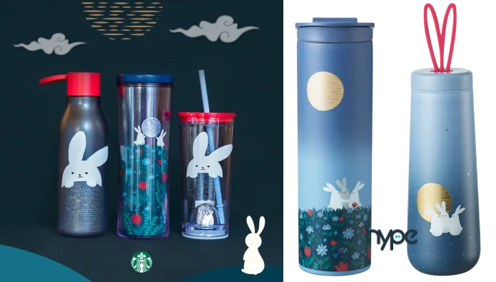 The Starbucks Mid-Autumn Festival Collection consisting of tumblers, water bottles and mugs are available in stores. The artwork used throughout the collection is based on the story of auspicious bunnies dancing under the full moon to symbolise the merriness of the harvest season.
