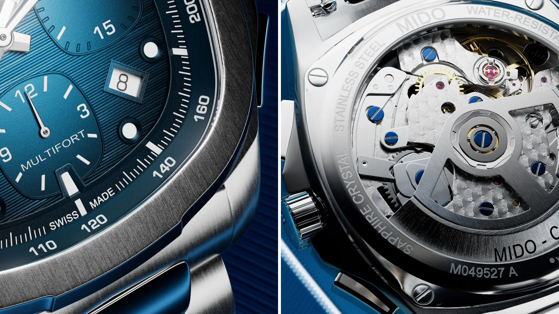 On the dial, three counters track seconds, minutes and hours, complemented by a tachymeter scale along the flange. A discreet date window at 4:30 completes the design without interrupting its symmetry. The sapphire crystal caseback reveals the beautifully decorated movement, with blued screws and an openworked rotor engraved with the MIDO logo—a reminder that true craftsmanship is as much about what’s inside as what’s seen.