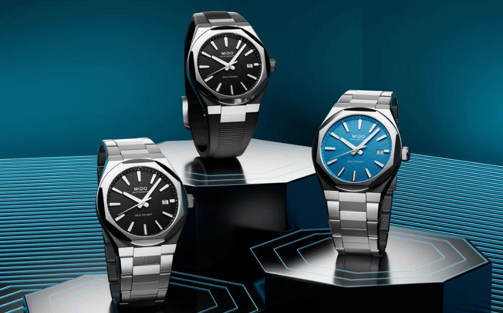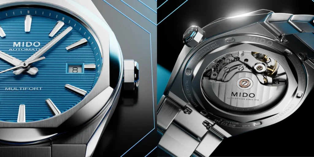 The other highlight of the show is the eight-sided bezel, the crown echoing this geometry on the side of the satin-finished and polished steel case, and the play of light even on the case back, which also features eight sides. For optimal reliability, the Multifort 8 One Crown can withstand a pressure of up to 10 bar (100 m/330 ft). Its satin-finished metal bracelet features a folding clasp and MIDO’s quick-change system, a striking feature for a versatile style.