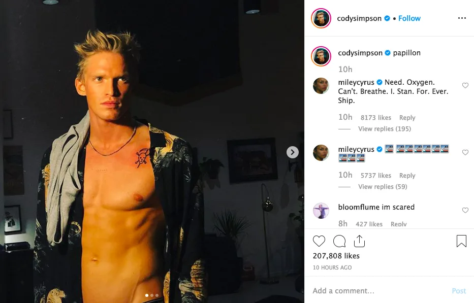 The controversial singer commented on Cody Simpson’s new Instagram post, which sees him displaying his impressive chisel abs. You can also spot his new skull and crossbones line drawing on his right upper chest.