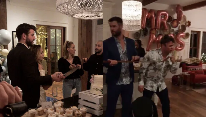 It looks to be a low-key ceremony where the wedding bash was held at home. Miley is seen wearing an off-shoulder white with her hair worn loose. Meanwhile, Liam looks dapper in his suit and matching black tie.