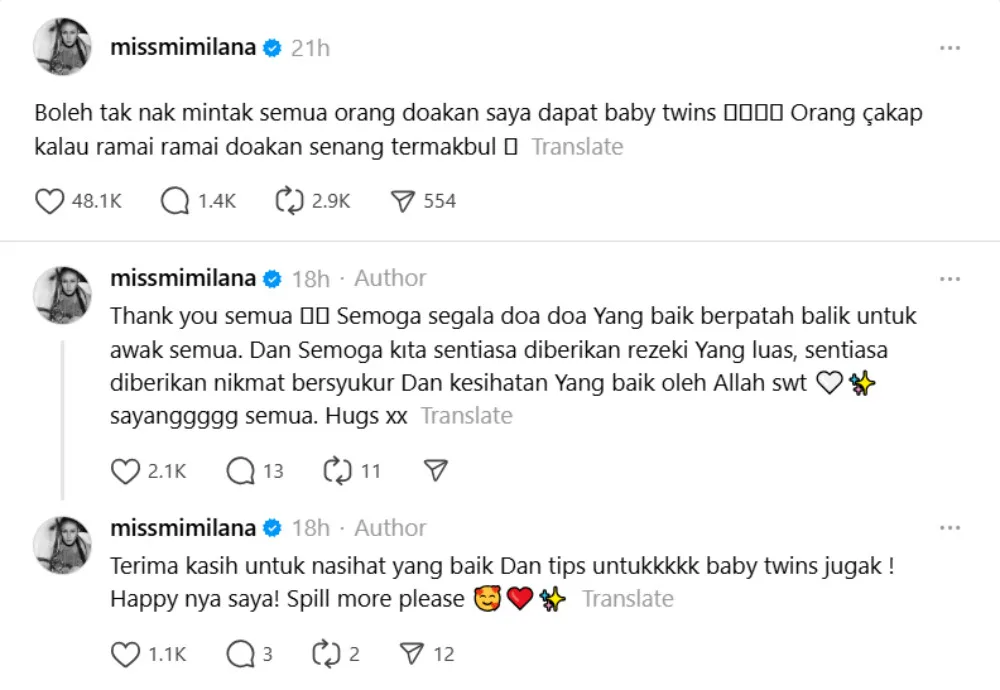 Many also said they look forward to seeing Mimi start a family with husband, actor Syafiq Kyle, noting that their children would inherit their good looks. The 29-year-old then responded to the comments, thanking fans and netizens for the overwhelming support. She also expressed gratitude to those who shared tips to hopefully increase her chance of getting pregnant with twins.