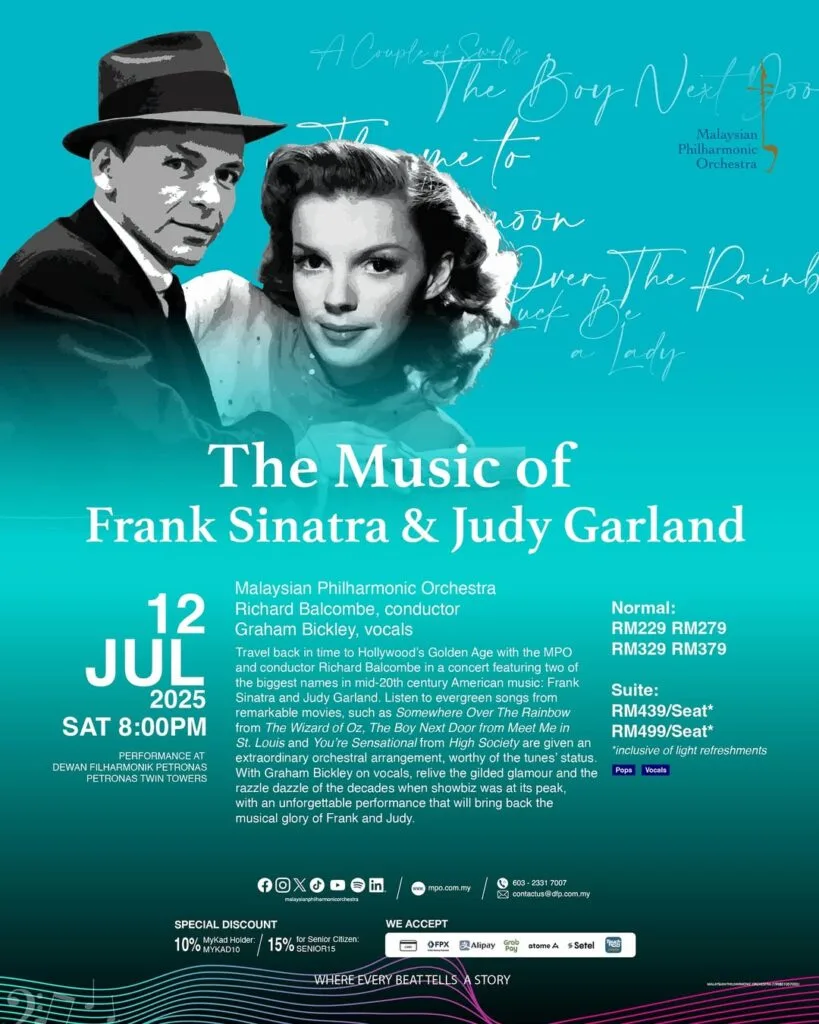Travel back in time to Hollywood’s Golden Age with the Malaysian Philharmonic Orchestra in a concert featuring two of the biggest names in mid-20th century American music: Frank Sinatra and Judy Garland. Click here to get tickets to relive the gilded glamour when showbiz was at its peak!