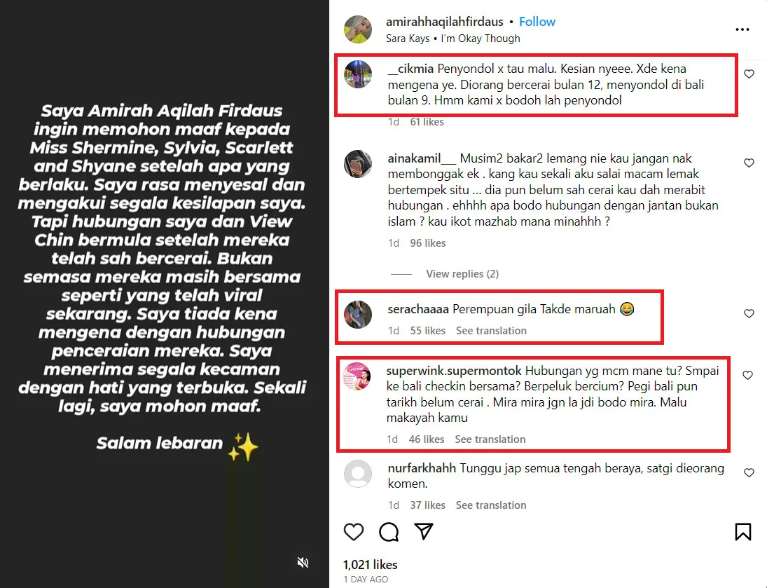 The apology was uploaded in a post on 23rd April. “I, Amirah Aqilah Firdaus, want to apologise to Miss Shermine, Sylvia, Scarlett and Shyane for what has happened. I regret and admit my mistakes,” the apology read. However, it didn’t end there.