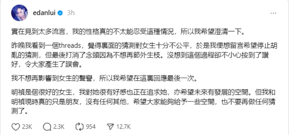 The MIRROR member also took to Threads to personally address his comments about Lin Min-Chen. In his post, Edan wrote, “Min-Chen is a great person. I like her very much, and I am pursuing her romantically. I also hope that there will be room for our relationship to develop in the future. But for now, Min-Chen and I are just friends, nothing more. I hope everyone can give us some space and stop making any guesses.”