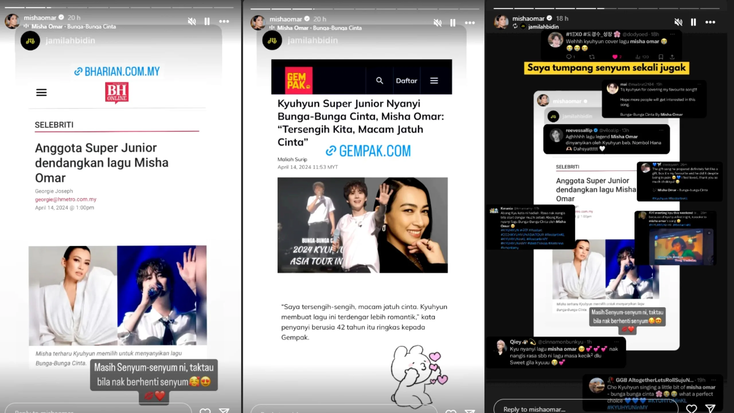 Shortly after the concert, fans were raving about Kyuhyun’s rendition. Word soon got to Misha Omar when fans started tagging the Malaysian singer on social media. The songstress said that she feels honoured and can’t stop smiling. “Kyuhyun made the song sound more romantic,” the 42-year-old told Gempak. Misha has also been reposting the reactions from fans online.