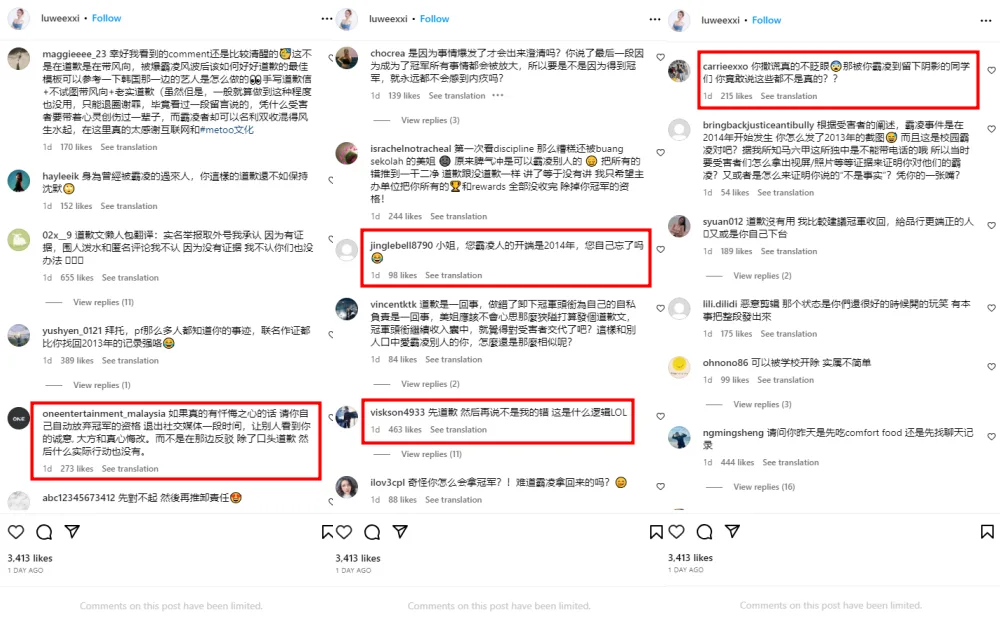 A few also opined Luwe Xin Hui’s actions would speak louder than words. “If you are really repentant, please voluntarily give up your (title) as champion and quit social media for some time to let others see your sincerity, generosity and true repentance,” one suggested.