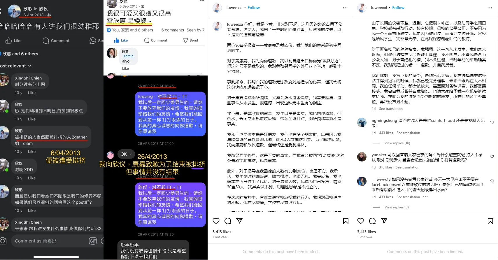 “In the past two days, I have spent some time thinking about the past and reflecting on it,” Luwe started. “The following is my apology and clarification.” She claimed that two of the netizens who had made allegations against her were indeed her classmates 黄康嘉 (Huang Kangjia) and 戴欣仪 (Dai Xinyi) from junior high.