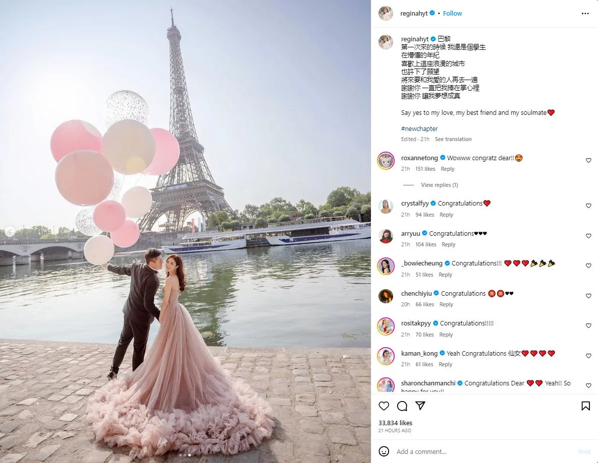 “I was a student when I first came here,” she shared in her caption. “I fell in love with this romantic city at an ignorant age, (and) made a wish to return here again in the future with the person I love.” Well, Regina’s wish certainly came true as her photos show her looking radiant in a gown, him in a smart tux, and noticeably enough, a large ring on her ring finger.