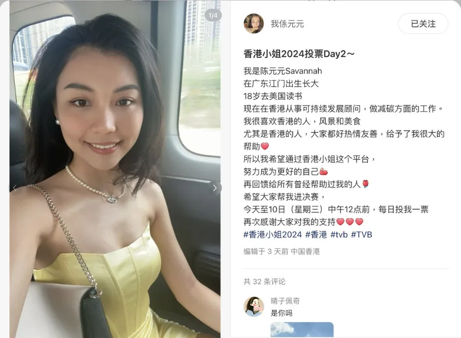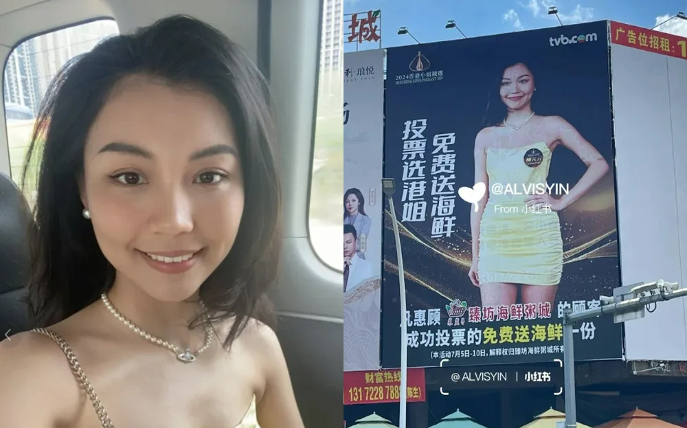Recently, a netizen shared a photo of a billboard located in a city in China, which seems to be rallying votes for Miss HK Pageant preliminary contestant Savannah Chen (陳元元). The billboard consists of a photo of Savannah and the phrase, “Every customer who patronises Zhenfang Seafood Porridge City will receive a free piece of seafood if you successfully vote”. Also spotted on the billboard were the Miss HK and the TVB.com logos.