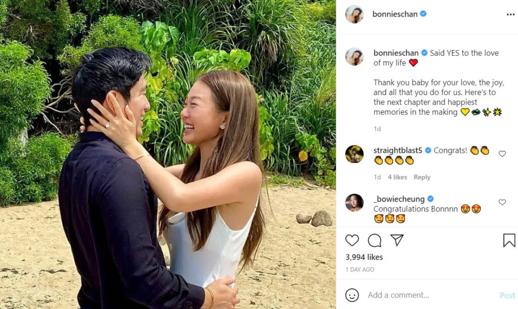 Bonnie and Meng Jun announced their engagement yesterday (27th May) on their own Instagrams respectively. According to their messages, Meng Jun proposed and (obviously) Bonnie said yes. The couple sweetly thanked each other for their love. “Here’s to the next chapter and happiest memories in the making!” they captioned.