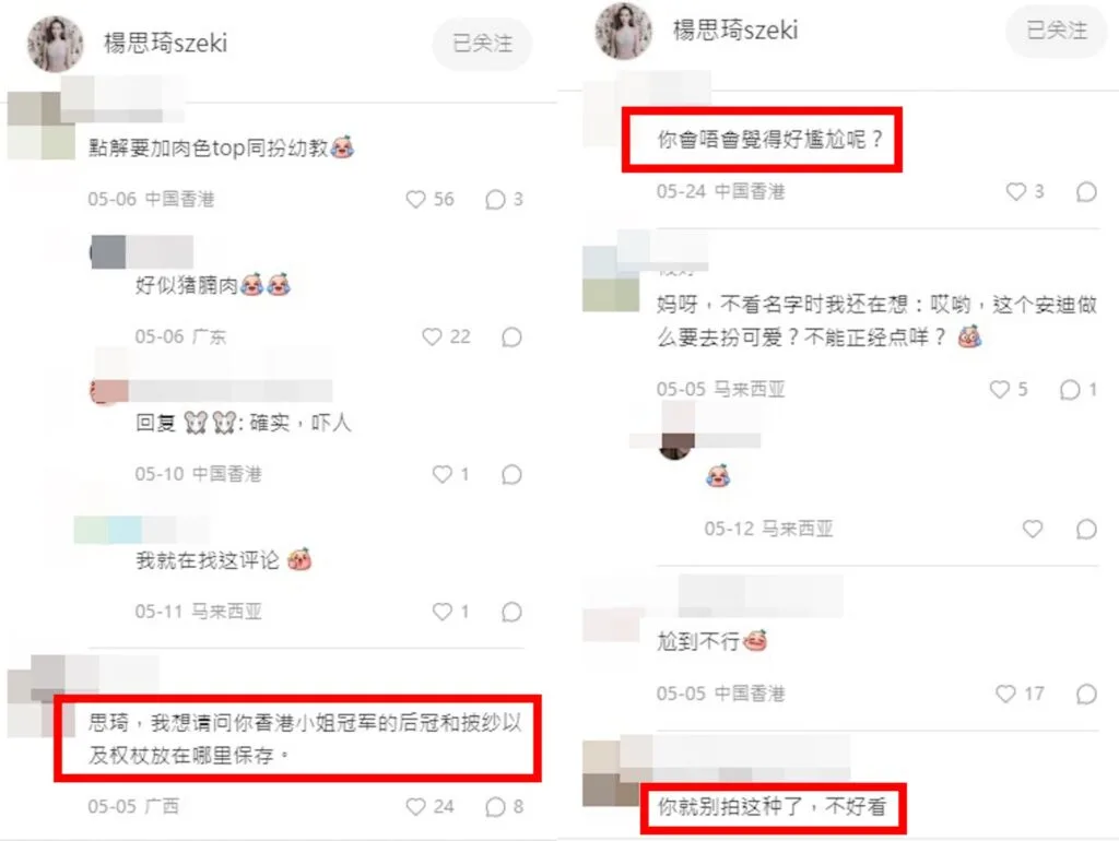 Several were thrown off by her visible underwear, with some remarking that she was wearing a “bra for grandmothers” while others admitted they mistook the bra for stretch marks. A few netizens also called her out for acting “childish”. “Don’t you feel embarrassed?” one asked, while another said: “Don’t pretend to be cute at (your) age.” One even commented: “Please maintain the image of Miss Hong Kong.”