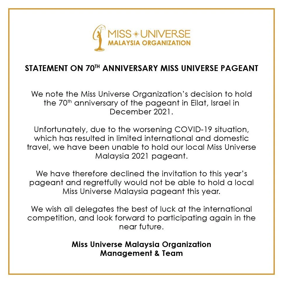 Unfortunately, due to the worsening Covid-19 situation, which has resulted in limited international and domestic travel, we have been unable to hold our local Miss Universe Malaysia 2021 pageant.
