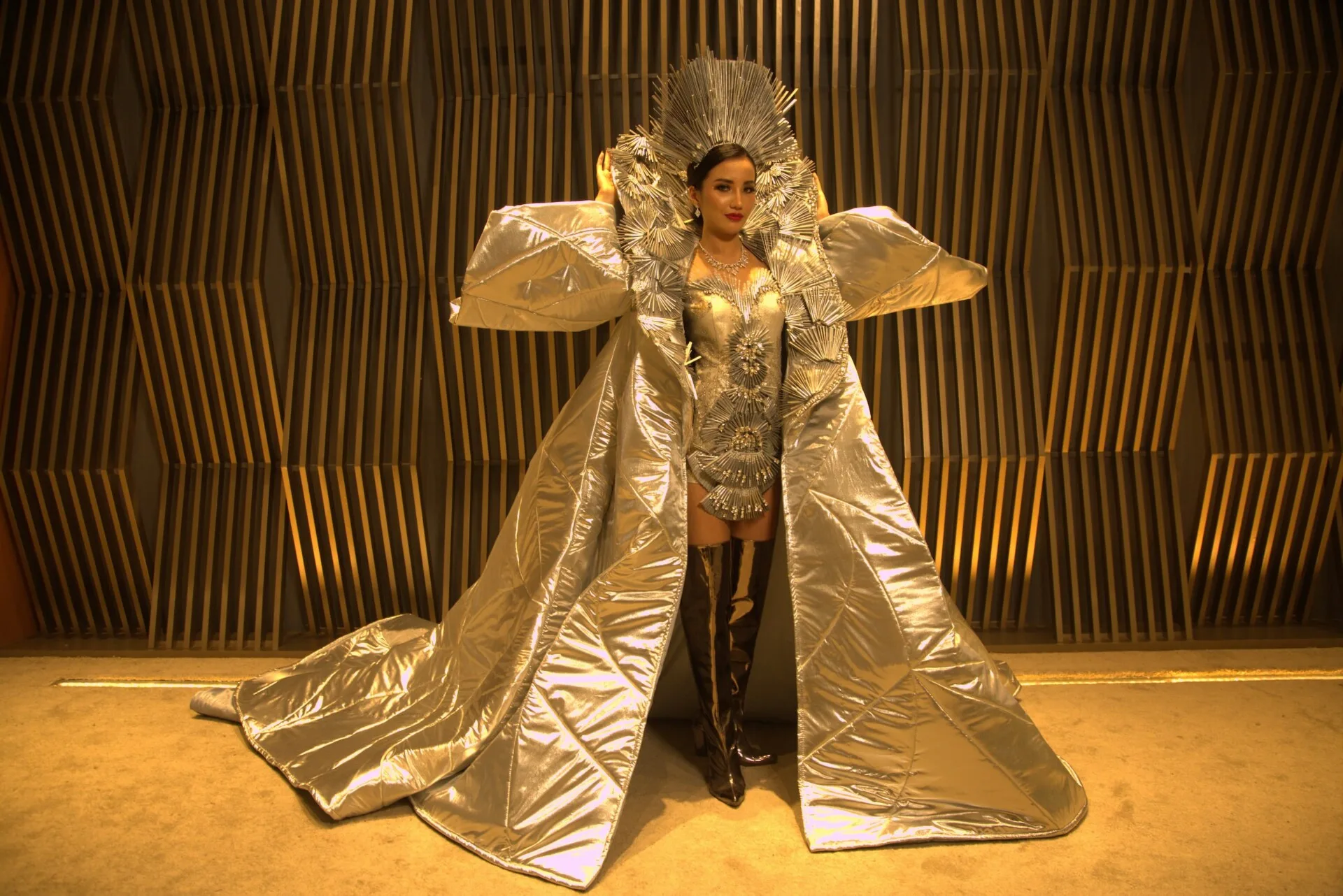 Along with the headpiece and boots, the dress weighed more than 10kg! Imagine walking the runway with that weight – a whole 10 kilograms of incomprehensible beauty! The mastermind behind this beautiful costume is none other than the eco-conscious local designer, Hatta Dolmat.