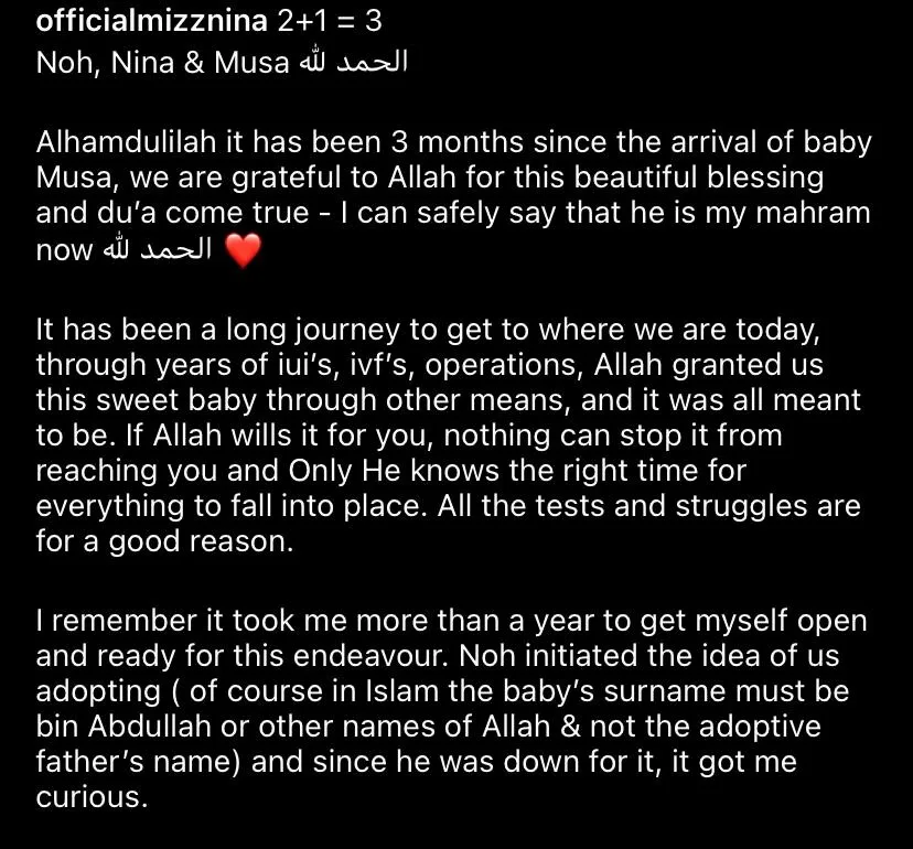 “Alhamdulilah it has been 3 months since the arrival of baby Musa, we are grateful to Allah for this beautiful blessing and du’a come true – I can safely say that he is my mahram (family member) now,” the former musician announced. In the same post, Mizz Nina also recounted the couple’s journey and struggle in conceiving their first child.