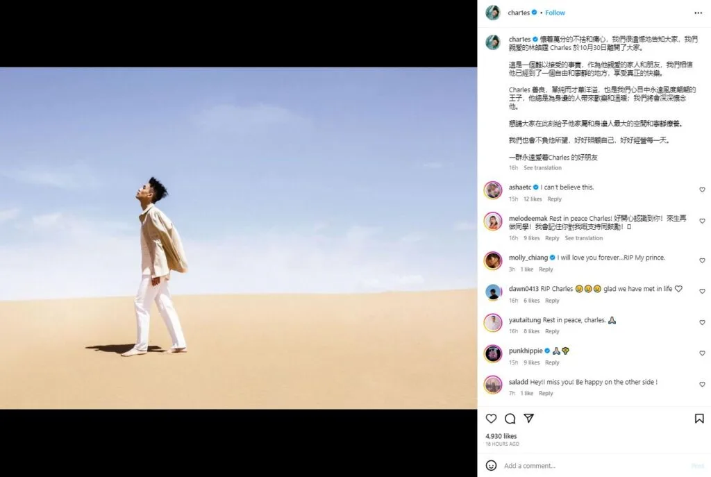 Friends of Charles Lin were the first to break the news, with many taking to their socials to pen a final farewell to him. The post on his official Instagram account, signed by “a group of good friends who will always love Charles” reads as such: “With great reluctance and heartache, we regret to inform you that our dear Charles Lin passed away on 30th October.”