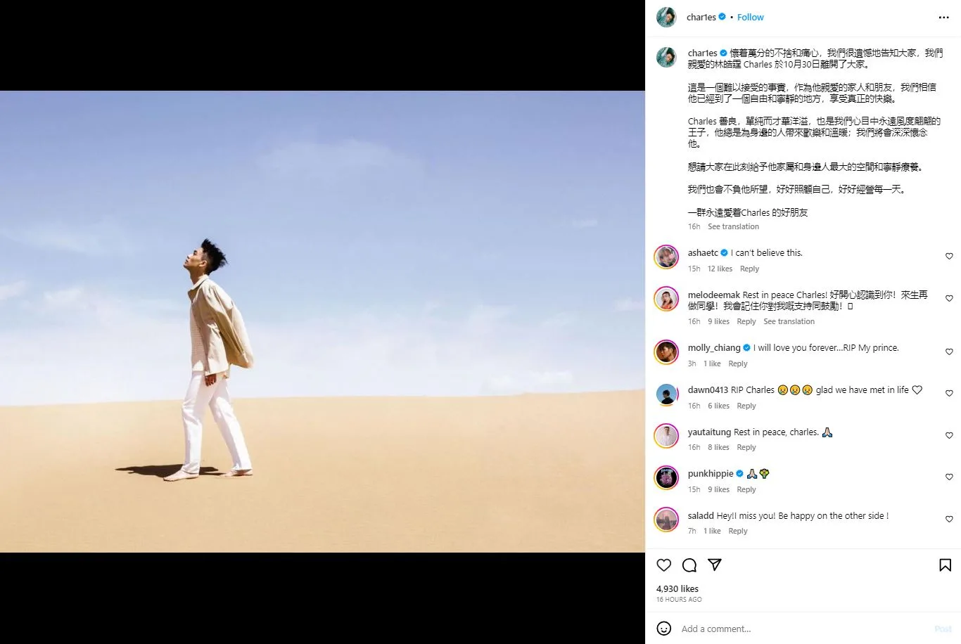 Friends of Charles Lin were the first to break the news, with many taking to their socials to pen a final farewell to him. The post on his official Instagram account, signed by “a group of good friends who will always love Charles” reads as such: “With great reluctance and heartache, we regret to inform you that our dear Charles Lin passed away on 30th October.”