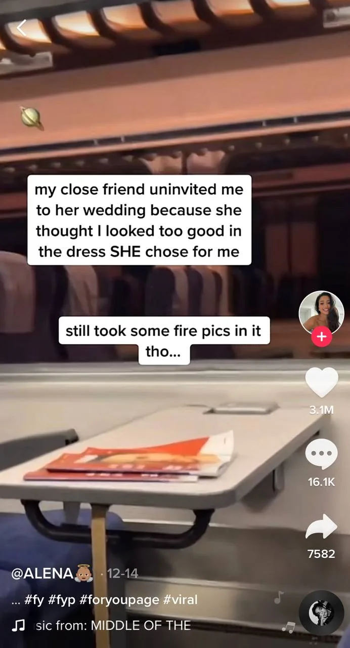 It’s a normal occasion for brides to pick her bridesmaids’ outfits for the wedding. No one likes to be outshone during their own wedding. However, in Alena’s case, her outfit was picked by the bride herself, and the bride was still unsatisfied. Especially after seeing pictures of her trying the blue-sequinned dress on. The 21-year-old Turkish model stated in the TikTok video, “My close friend uninvited me to her wedding because she thought I looked too good in the dress SHE chose for me.”