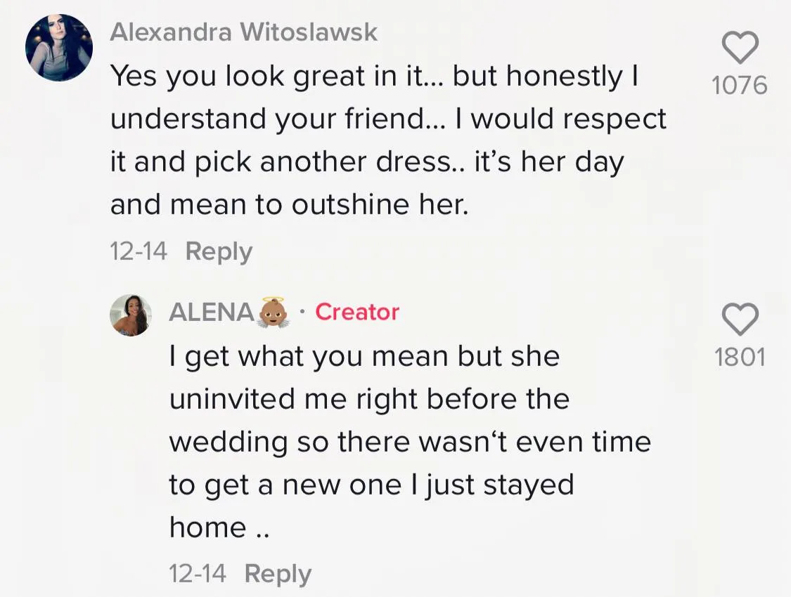 Despite the support given by most in her comments section, there were still some who empathised with the bride, like this TikTok user, “Yes, you look great in it.. But honestly, I understand your friend.. I would respect it and pick another dress.. It’s her day and (it’s) mean to outshine her.” Alena refuted the statement with her side of the story, “I get what you mean, but she uninvited me right before the wedding so there wasn’t even time to get a new one. (So), I just stayed home.”