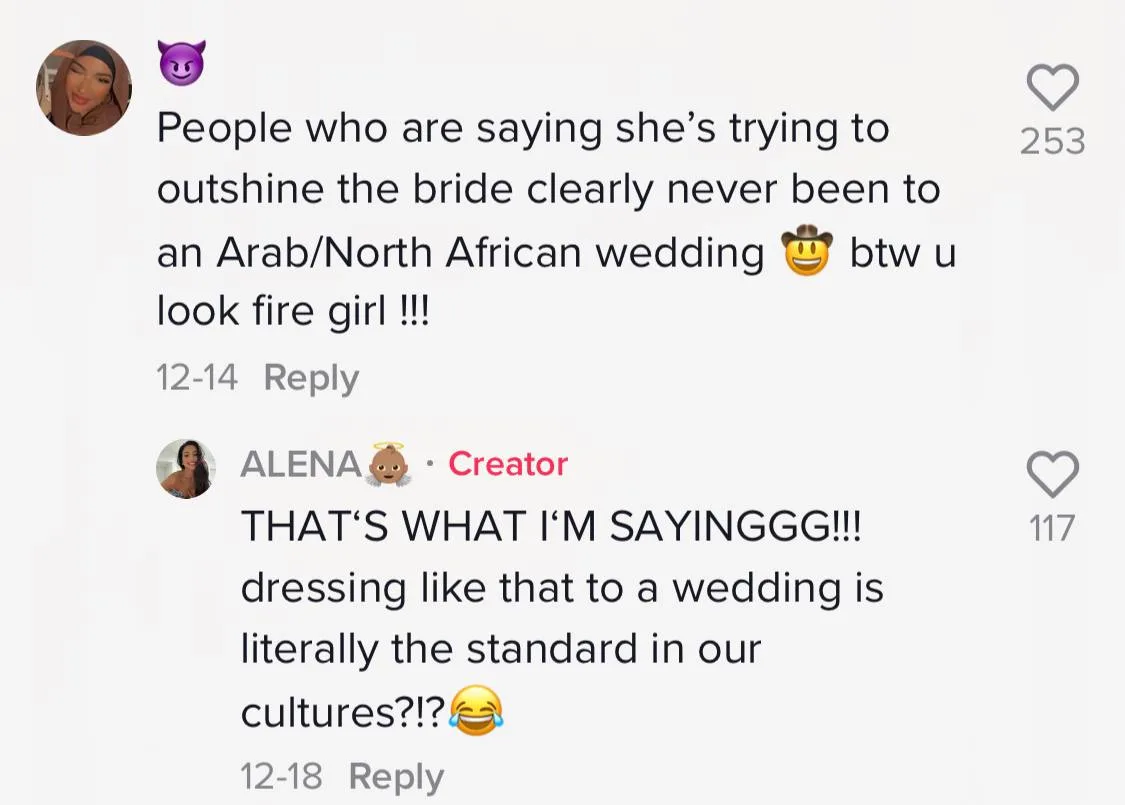 The TikTok video has gained more than 3 million likes and more than 16 thousand comments. A netizen commented, “I mean, she (is) kinda right. You can’t come like that (to) my wedding and expect me not to run away with you. Like at that point, I’m marrying you.” While another TikTok user stated, “People who are saying she’s trying to outshine the bride clearly (has) never been to an Arab/North African wedding. BTW, you look fire girl!” to which she responded, “That’s what I’m saying! Dressing like that to a wedding is literally the standard in our culture?!”