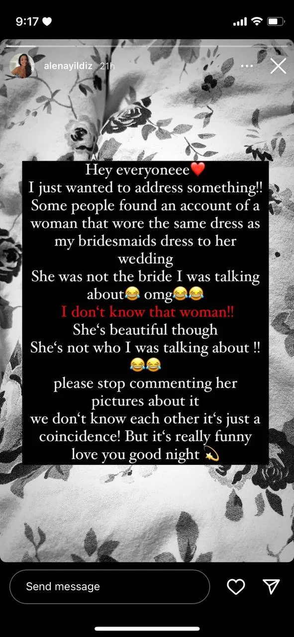 And, netizens being netizens, they somehow managed to find the social media account of the bride. Or so they thought. However, Alena stated yesterday (26th December) on her Instagram story and her TikTok, that the woman they attacked isn’t her friend.