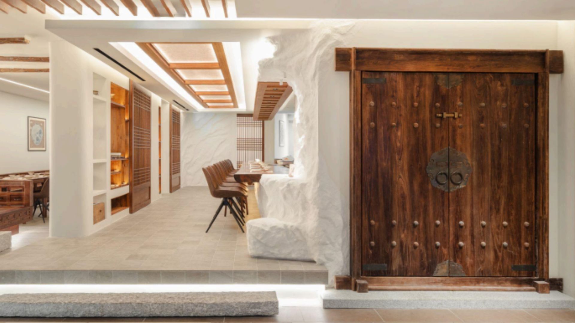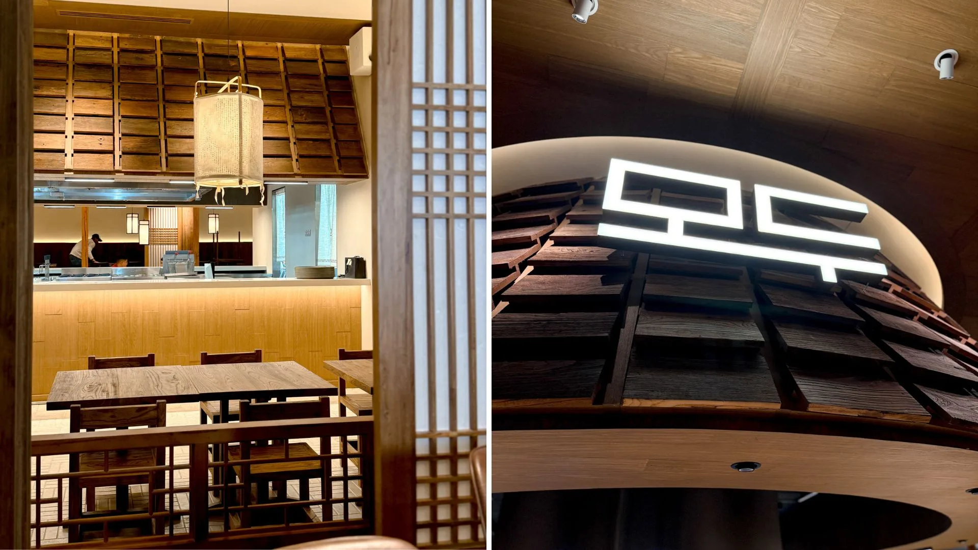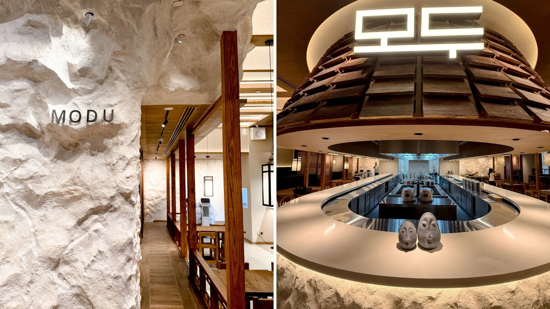 Step inside MODU and you’ll feel like you’ve been transported to a sleek, modern Hanok in Seoul. Covering over 3,000 square feet, the space is designed with warm wood tones, Korean latticework, and soft lighting that create a calm, cosy vibe. Diners can even watch the chefs in action at the open kitchen or enjoy a private meal in one of the VIP suites.