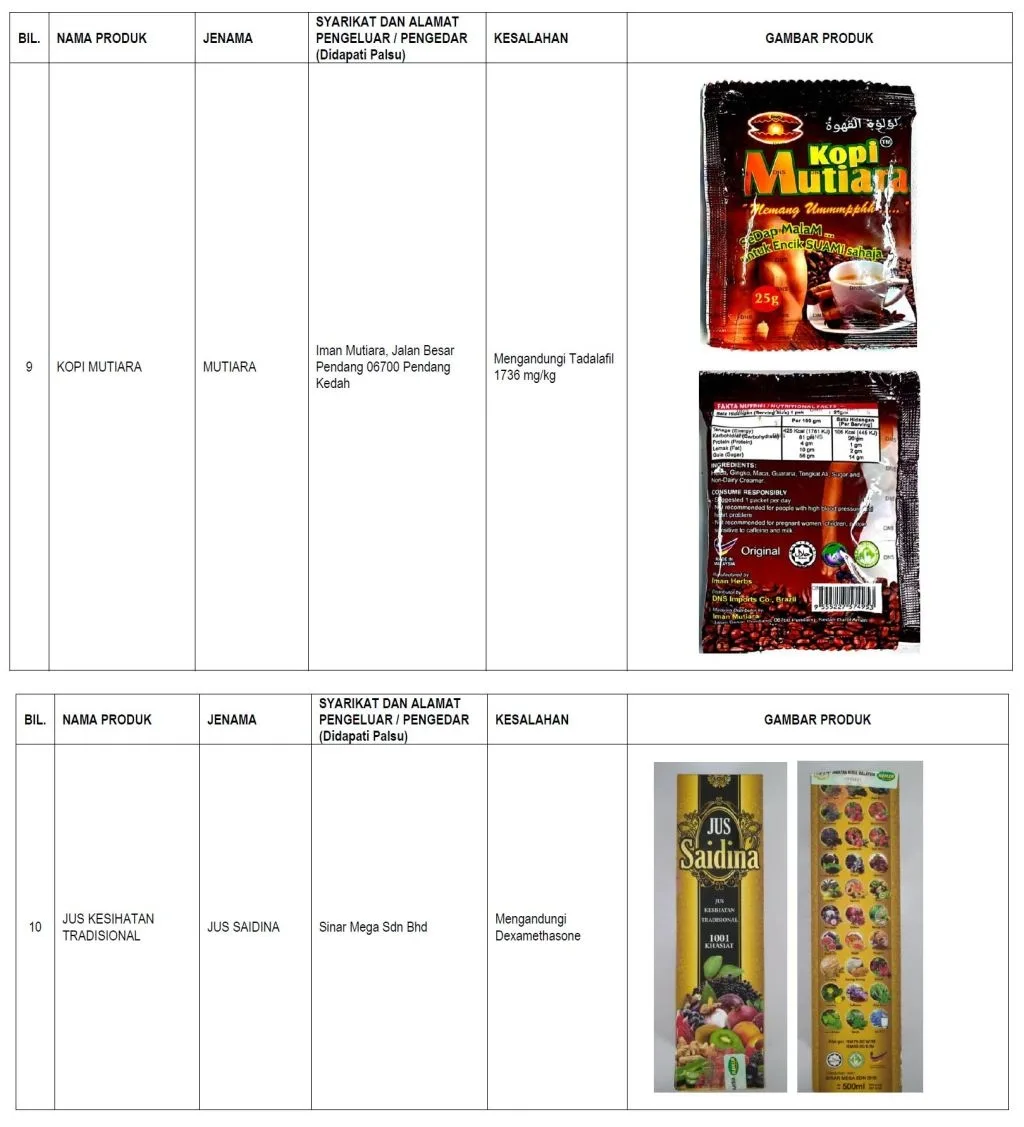 The food products detected consists mostly of instant coffee packs, herbal drinks and sex enhancement pills. MOH found these products to contain scheduled drugs such as sildenafil, tadalafil, dexamethasone and prednisolone, which are prohibited ingredients as it doesn’t comply with the Food Act 1983 and the regulations made thereunder.