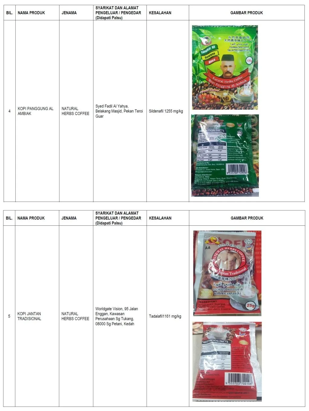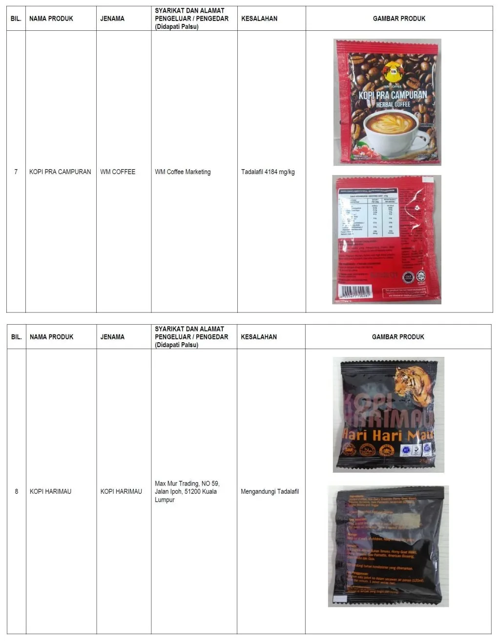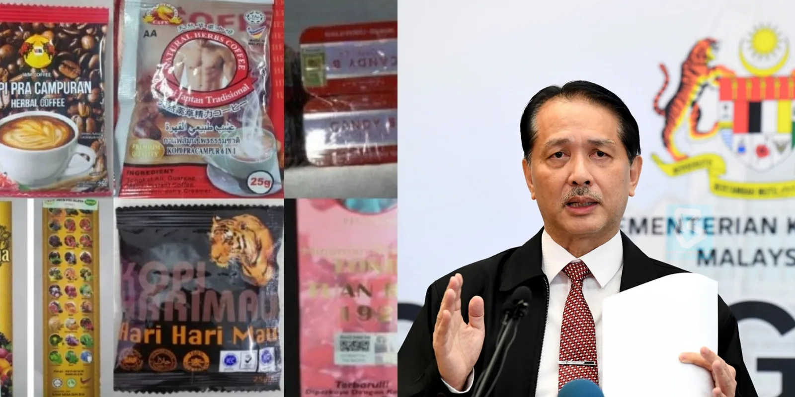 The food products detected consists mostly of instant coffee packs, herbal drinks and sex enhancement pills. MOH found these products to contain scheduled drugs such as sildenafil, tadalafil, dexamethasone and prednisolone, which are prohibited ingredients as it doesn’t comply with the Food Act 1983 and the regulations made thereunder.