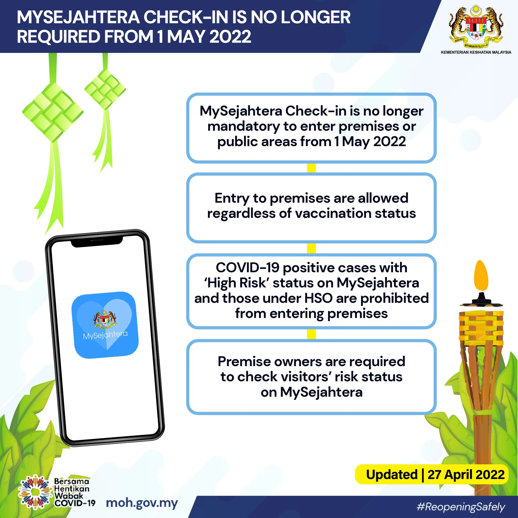 While you may not need to check into premises with MySejahtera anymore, you’ll likely still need the app. According to the Ministry of Health, entry to premises are permitted, regardless of your vaccination status. However, there will still be checks on your Covid-19 health status. This is because COVID-19 positive cases are still not allowed to enter premises.