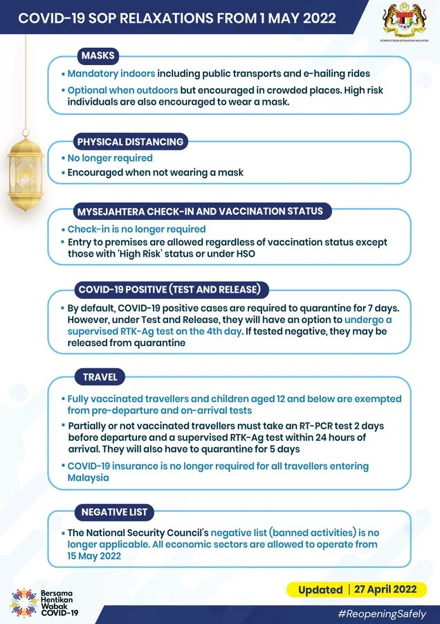 However, starting 1st May, this will all change. Health Minister Khairy Jamaluddin recently announced that masks will no longer be required for outdoor settings. Additionally, there is no longer a need to check-in to premises with MySejahtera!