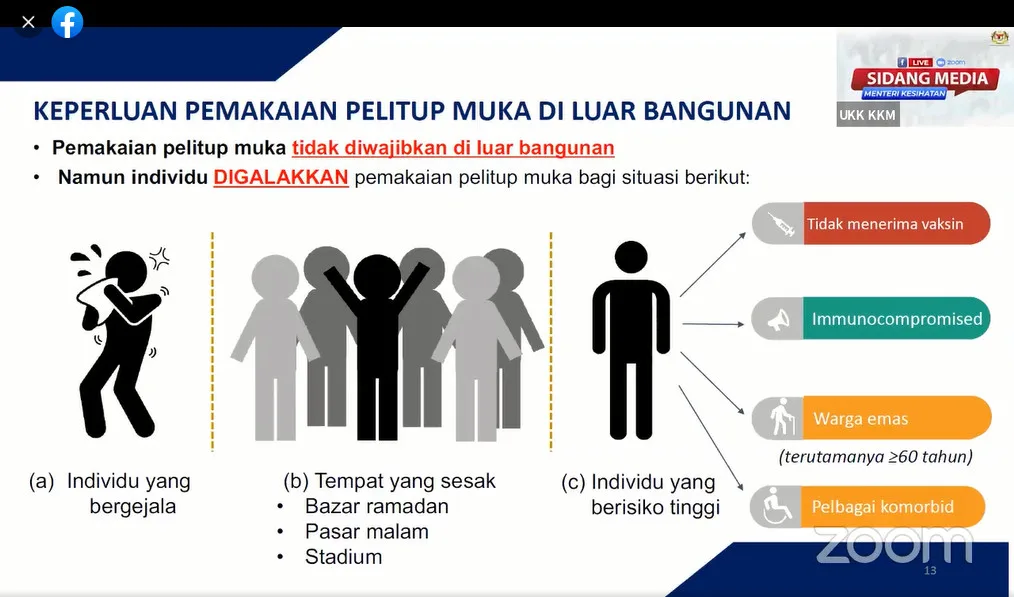 Wearing a mask outside is still encouraged if the area is crowded, or if you are a high-risk individual. For clarification, high-risk individuals involve senior citizens, the immunocompromised, and those with comorbidities. Additionally, the Ministry of Health stressed wearing a mask in these areas: Ramadan Bazaars, pasar malam (night markets) and stadiums. Also, please do wear a mask if you have symptoms.