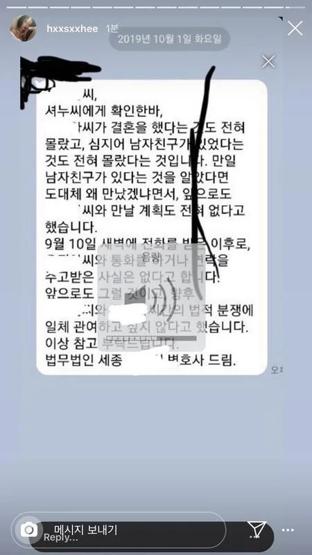 “After confirming with Shownu, we learned that Shownu had no idea that ‘A’ (the woman) was married or even had a boyfriend. If he knew that ‘A’ had a boyfriend, he would never have become involved with her, and he has no more plans to see ‘A’ in the future. Shownu has never been in contact with ‘A’ since 10th September. He does not plan to contact ‘A’ for any reasons in the future, and also does not wish to become involved in your lawsuit against ‘A’ in any form. Please keep that in mind.”