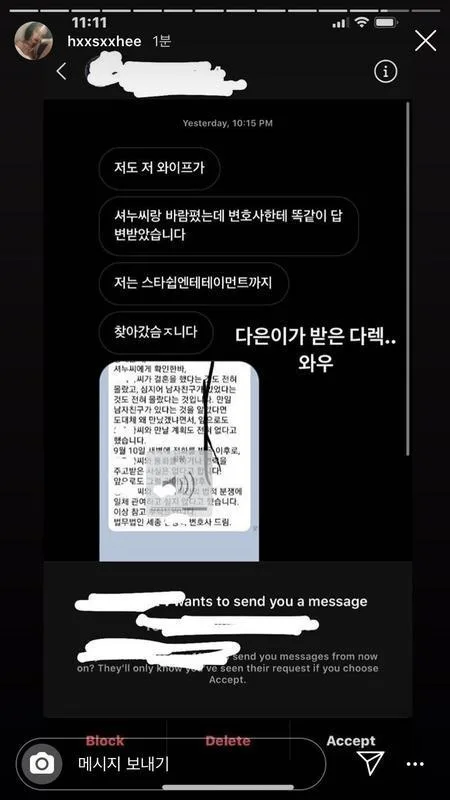 The former YG Entertainment trainee revealed a screenshot of a conversation between her girlfriend Jung Daeun (정다은) and an unnamed individual who claimed that his wife had an affair with the 27-year-old idol.