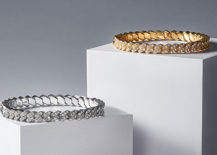More really is more. Combine colours, shapes and cuts. Mix metals – think gold, silver, even a hint of rose to make your jewellery feel more personal. Look for bands or rings with flat edges that’ll sit well together. And if you’re looking to layer your bracelets with a watch, style more durable pieces of different textures that’ll hold strong next to the timepiece.