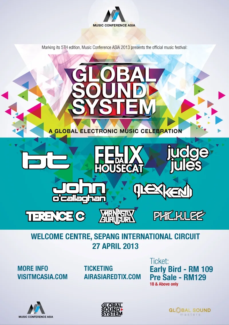 Music Conference ASIA uncovers its full line up for its official festival stage, GLOBAL SOUND SYSTEM! Music Conference ASIA and Global Sound System will take you on an audiovisual adventure this 27th April 2013 (Saturday) with top of the class, legendary electronic music acts – international and local.